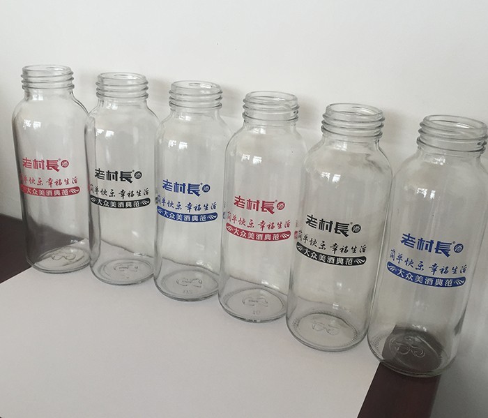 蒙砂酒瓶是在制品玻璃上,粘附一定大小面積的玻璃色釉粉,玻璃瓶廠經(jīng)過580~600℃的高溫烘烤,使玻璃色釉涂層凝結(jié)在玻璃外表,并顯現(xiàn)出具有與玻璃主體不同顏色的一種裝飾辦法。粘附玻璃色釉粉,可用排筆涂刷,亦可用膠輥滾涂。經(jīng)過絲印加工,能夠得到蒙砂面的樓空圖案。 其辦法是:在玻璃制品外表上,絲印一層由阻熔劑構(gòu)成的圖案紋樣。